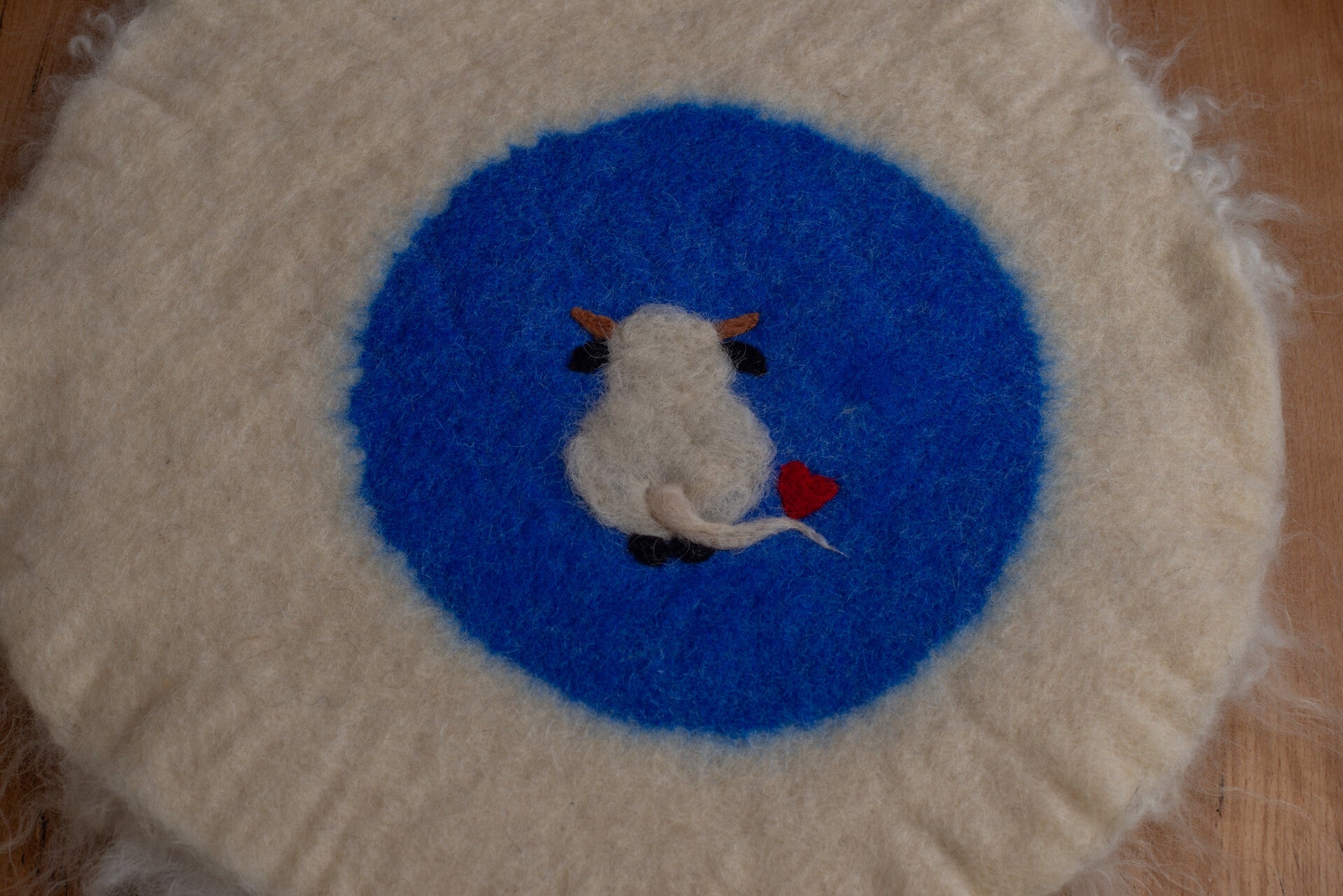 Für dieses Sitzfell wurde die fluffige Wolle von Herr Wagner verwendet. Es ist fast schneeweiss mit ganz wenig beigetönen. Durch die gewellte Wolle wirkt das Fell wie ein grosser Wattebausch. Die Rückseite besteht aus weisser kardierter Wolle vom Walliser Schwarznasenschaf und das Schäfchen wurde in Nadelfilztechnik auf einen Untergrund aus kobaltblau gearbeitet. Ein wunderschönes Fell für deine Gartenbank, deinen Bürostuhl oder einfach für deinen Lieblingssessel.