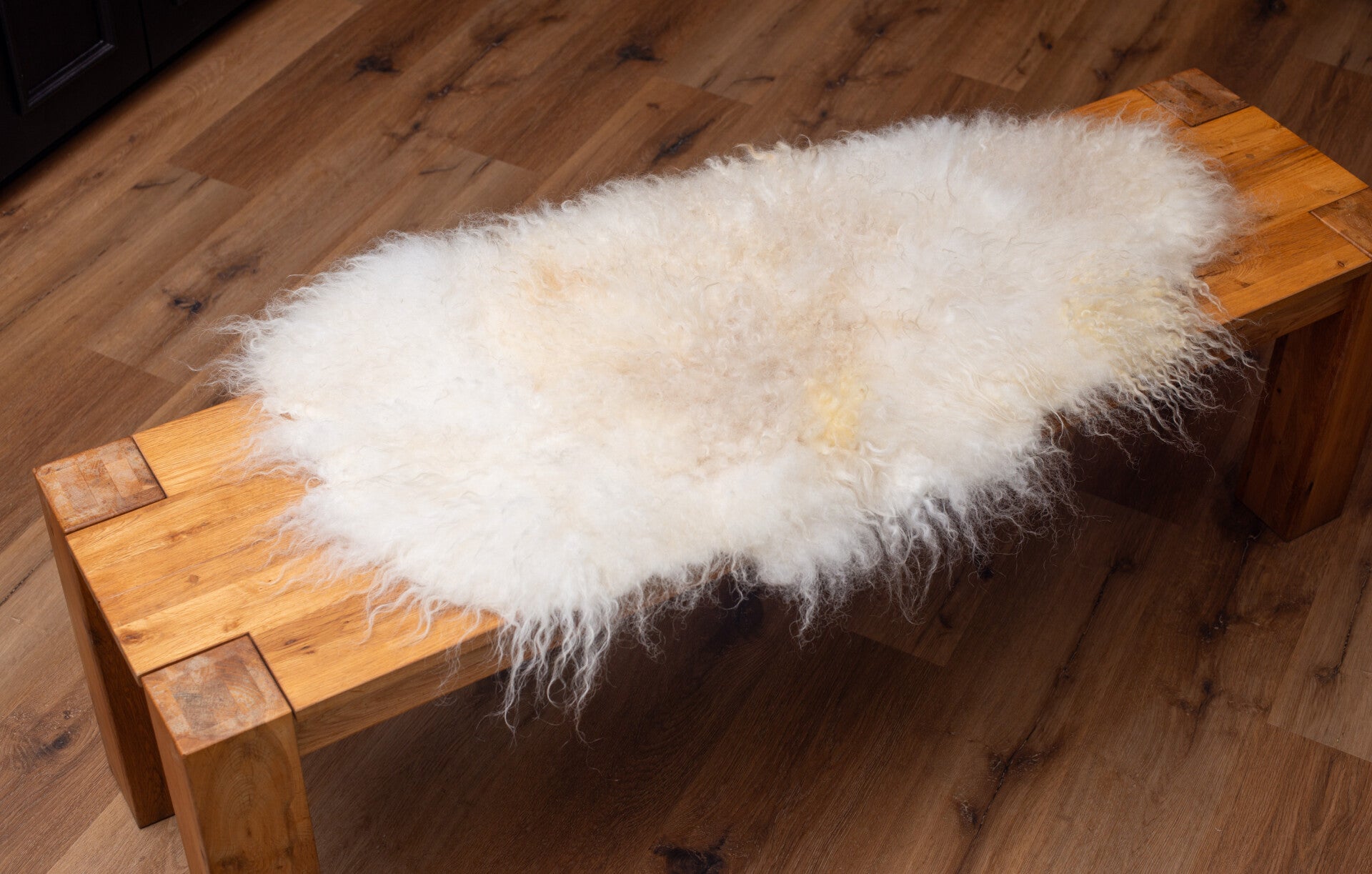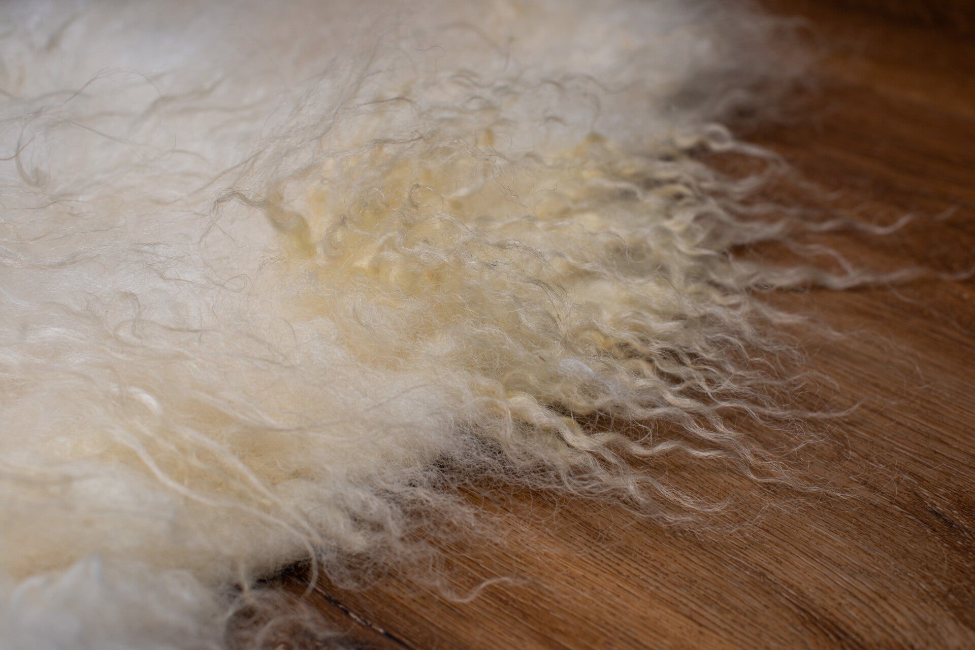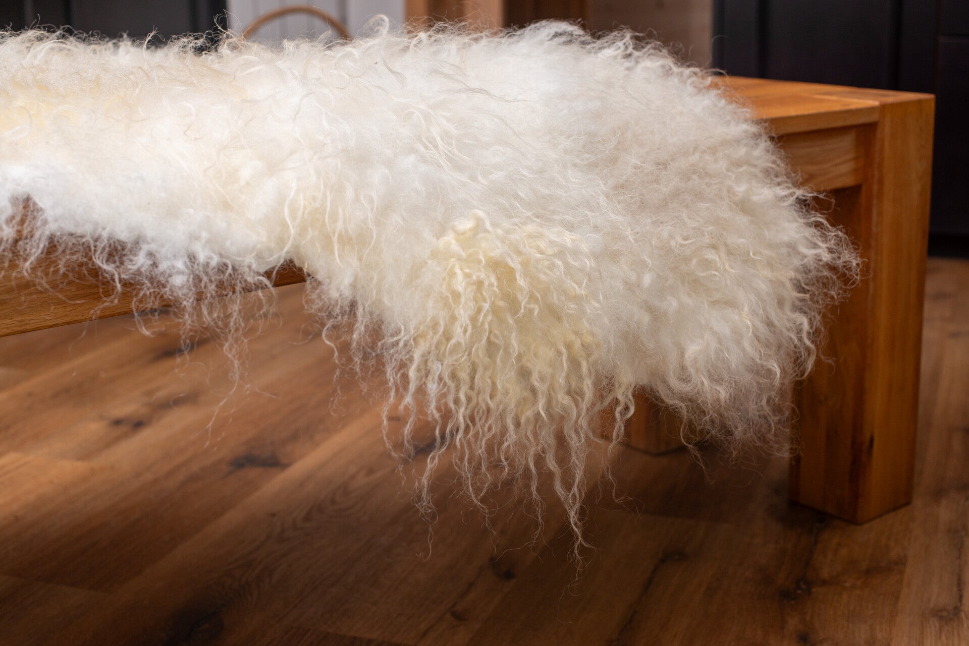 Dieses Fell besteht aus einem Wollmix von Gretchen, Grimhild, Herr Wagner und Pan. Die Kombination aus vier unterschiedlichen Wollstrukturen und Farben macht dieses Fell zu einer wilden Schönheit. Die Strukturen der Lockenpartien reichen von wellig weich bis wild gekringelt. Auch die Farbnuancen spielen zwischen schneeweiss und gelb-braun. Die Rückseite besteht aus kardierter Wolle vom Walliser Schwarznasenschaf in weiss. Das Schäfchen ist in Nadelfilztechnik auf einen Hintergrund in der Farbe "storm blue" gearbeitet. Dieses Fell vereint die natürliche und robuste Schönheit von vier tollen Walliser Schwarznasenschafen und macht deine Sitzbank, deine Gartenbank oder deinen Lieblingssessel so richtig gemütlich. Da die Schafe gerne draussen sind, wirst du in diesem Fell auch noch Heustückchen und Grassamen finden.