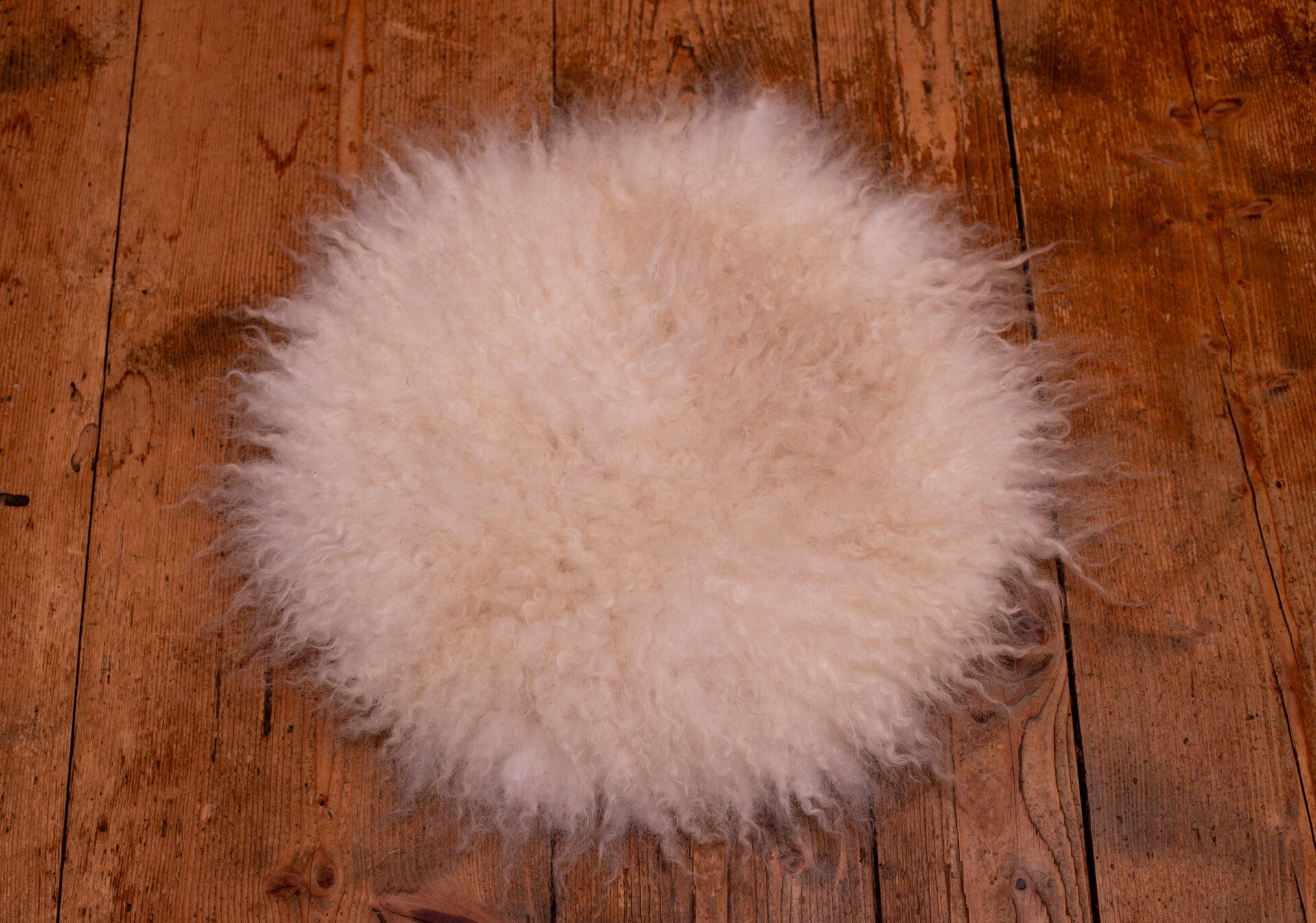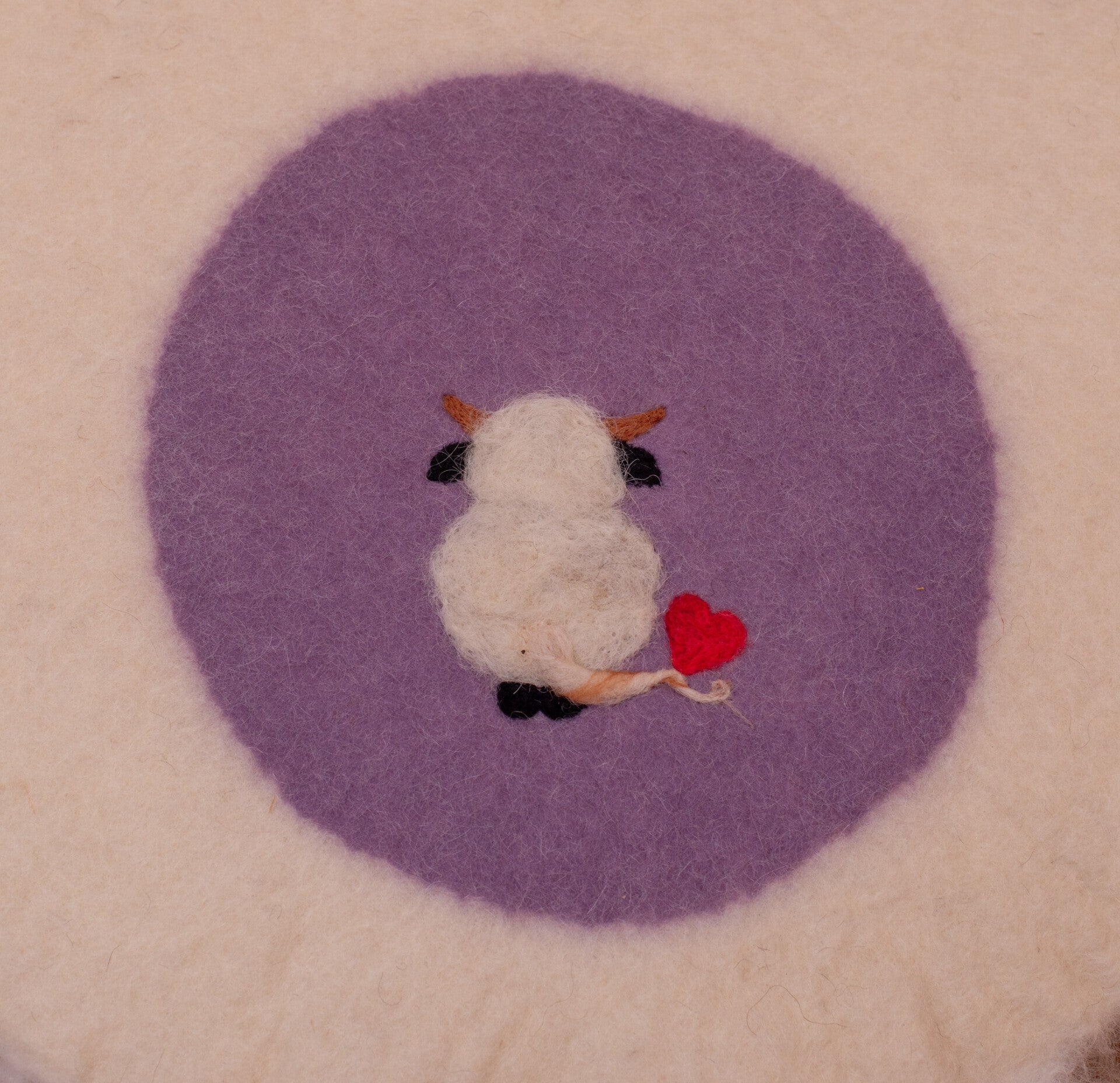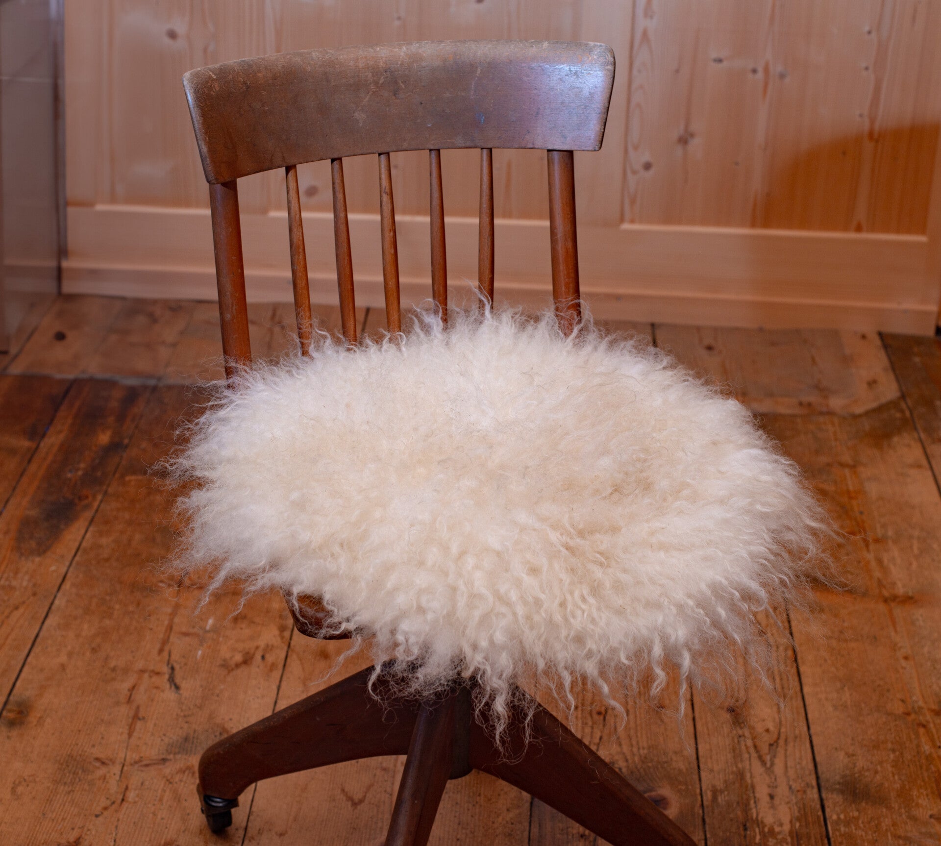 Dieses wunderbare Fell stammt von Grimhild. Die Farbnuancen der Wolle spielen zwischen reinweiss und leichten Beigetönen, ganz natürlich. Die Rückseite wurde in weiss gestaltet, mit kardierter Wolle vom Walliser Schwarznasenschaf. Und auf einen pastelllila Hintergrund wurde das kleine Schaf in Nadelfilztechnik gearbeitet. Die Lockenlänge variiert zwischen 10 und 15 cm.