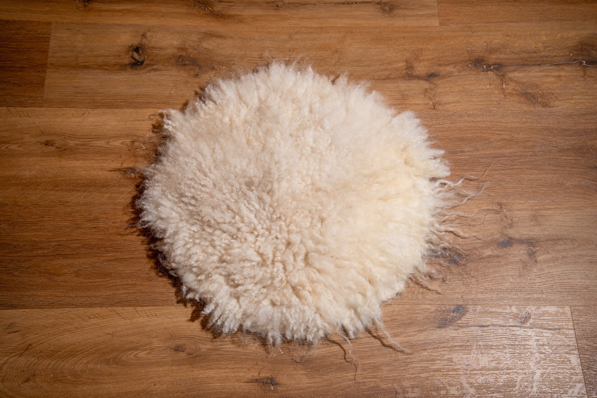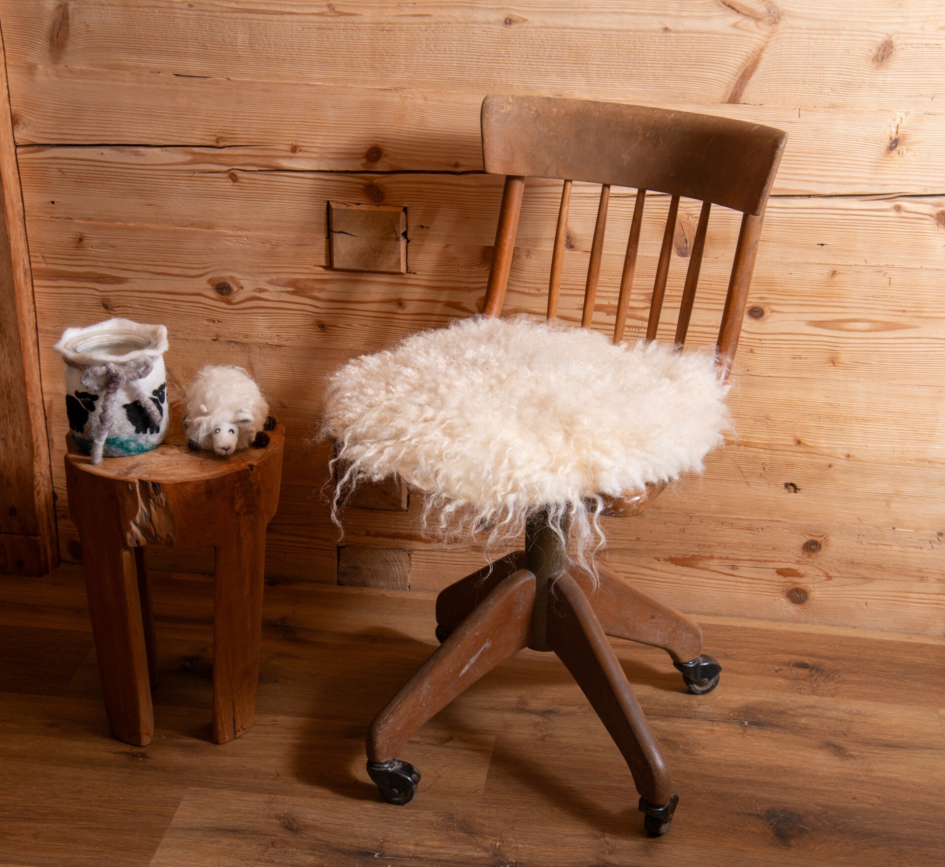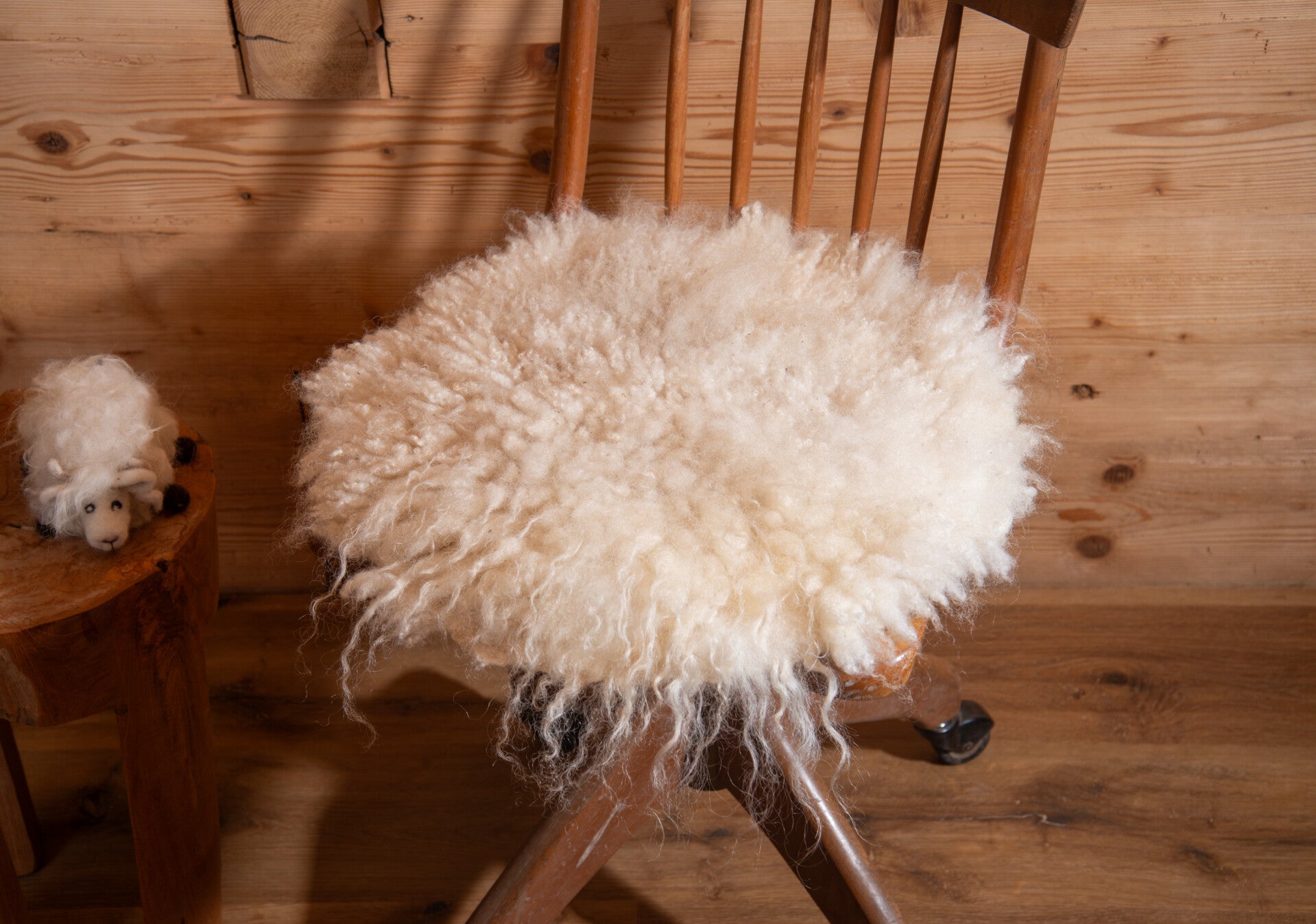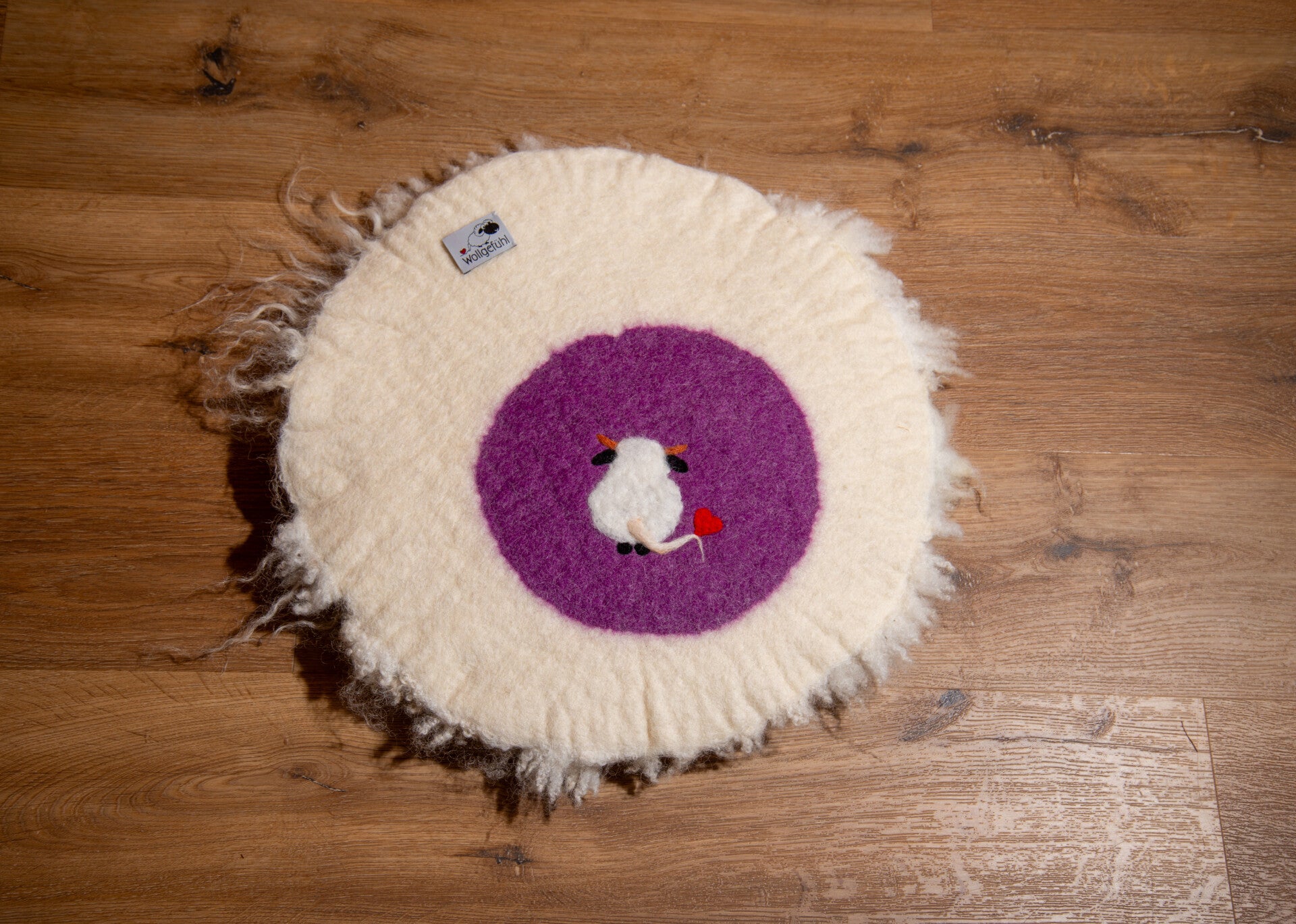 Dieses hübsche und kuschligweiche Fell stammt von Theo, einem ausgewachsenen Schwarznasenwidder. Es besteht aus vielen kleinen Kringellocken die eher kurz aber dafür sehr kompakt sind, was dieses Fell angenehm weich und wattig macht. Theo ist wie jedes Schaf gerne draussen unterwegs, weshalb in der kompakten Wolle noch einzelne Heustückchen und Sämerein zu finden sind. Das kleine Schäfchen auf der Rückseite ist in Nadelfilztechnik auf einen lila Hintergrund gearbeitet.